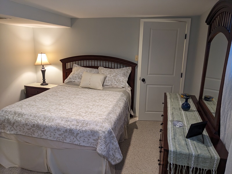 - Queen-sized bed with mattress topper, seven-drawer dresser, clothes rack; desk and chair. Linens provided.