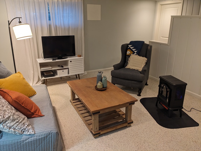 - Large adjacent sitting room/ den includes couch, arm chair, coffee table, TV with Roku hook-up, TV stand, storage wardrobe, and ‘fireplace-look’ electric heater