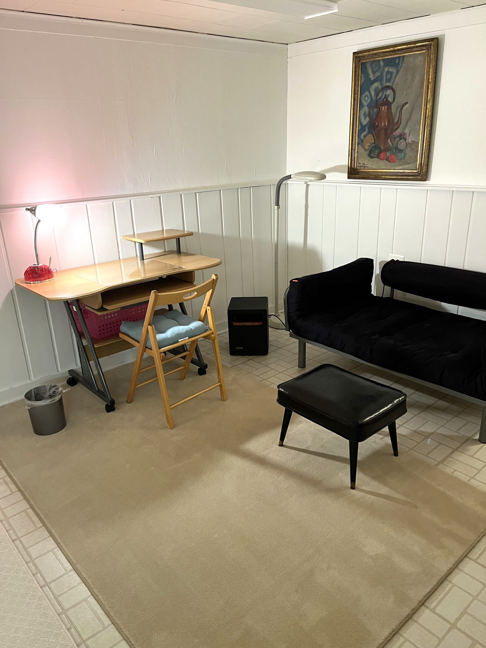 Full floor efficiency for rent short or long term, with 2 beds, a private bath, separate entrance, fully equipped kitchenette and natural light. NIH is a 5 minute, non-stop Metro ride away from the nearby Grosvenor Station in North Bethesda. Rent is only $1270 including utilities and internet for single occupancy. There is a desk and reading area with futon as well as a dining table, a large closet, a double chest of drawers, and plenty of storage. The use of the washer / dryer is also included. Located in an upscale, quiet neighborhood near many grocery stores. Double occupancy is an option for an additional fee.