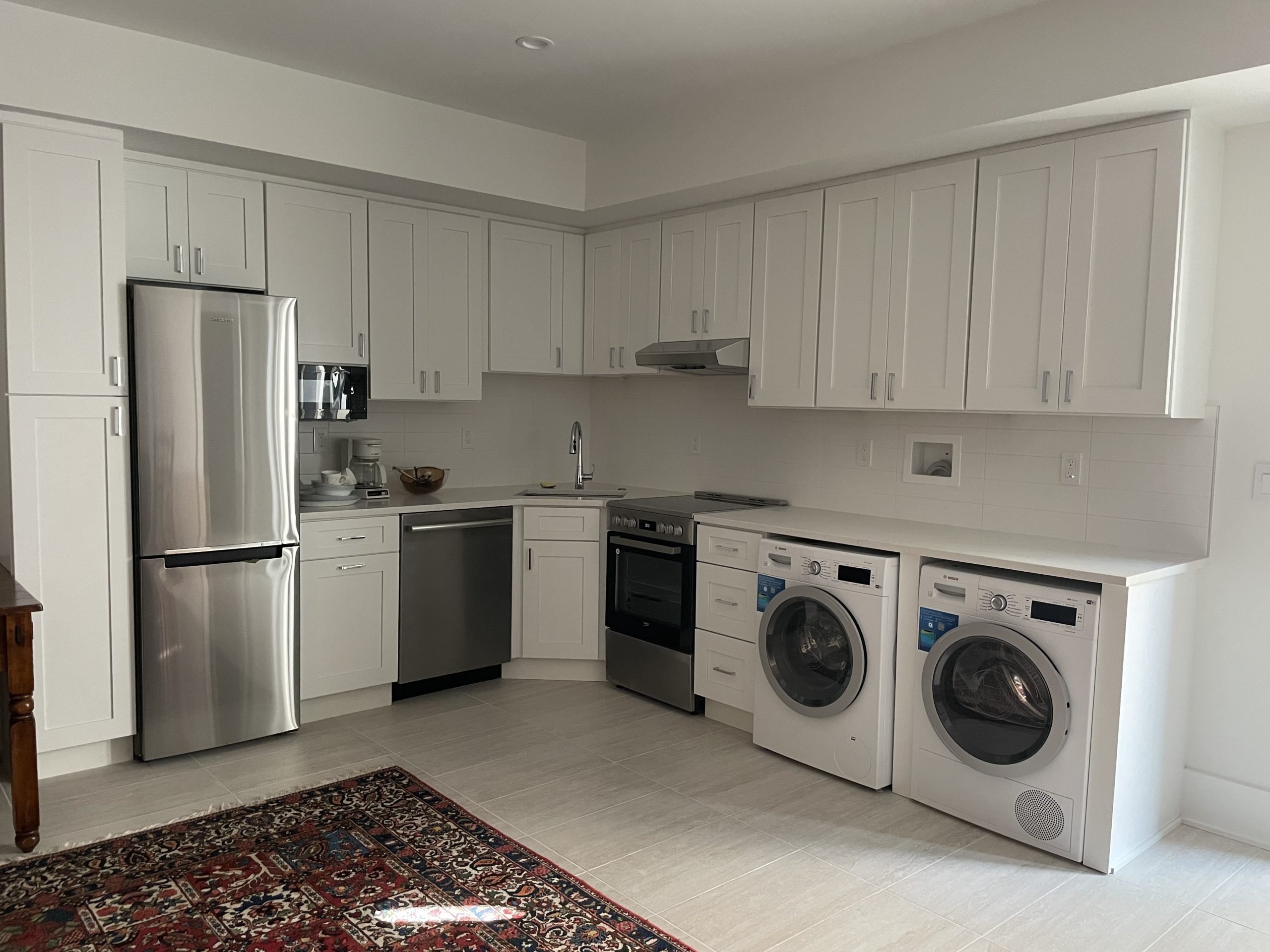 This stunning apartment comes fully furnished, providing you with everything you need for a comfortable and stylish living experience. Enjoy the privacy of your own entrance, a well-equipped kitchen, (dishwasher, electric range and a full refrigerator) and the convenience of an in-house private laundry facility.