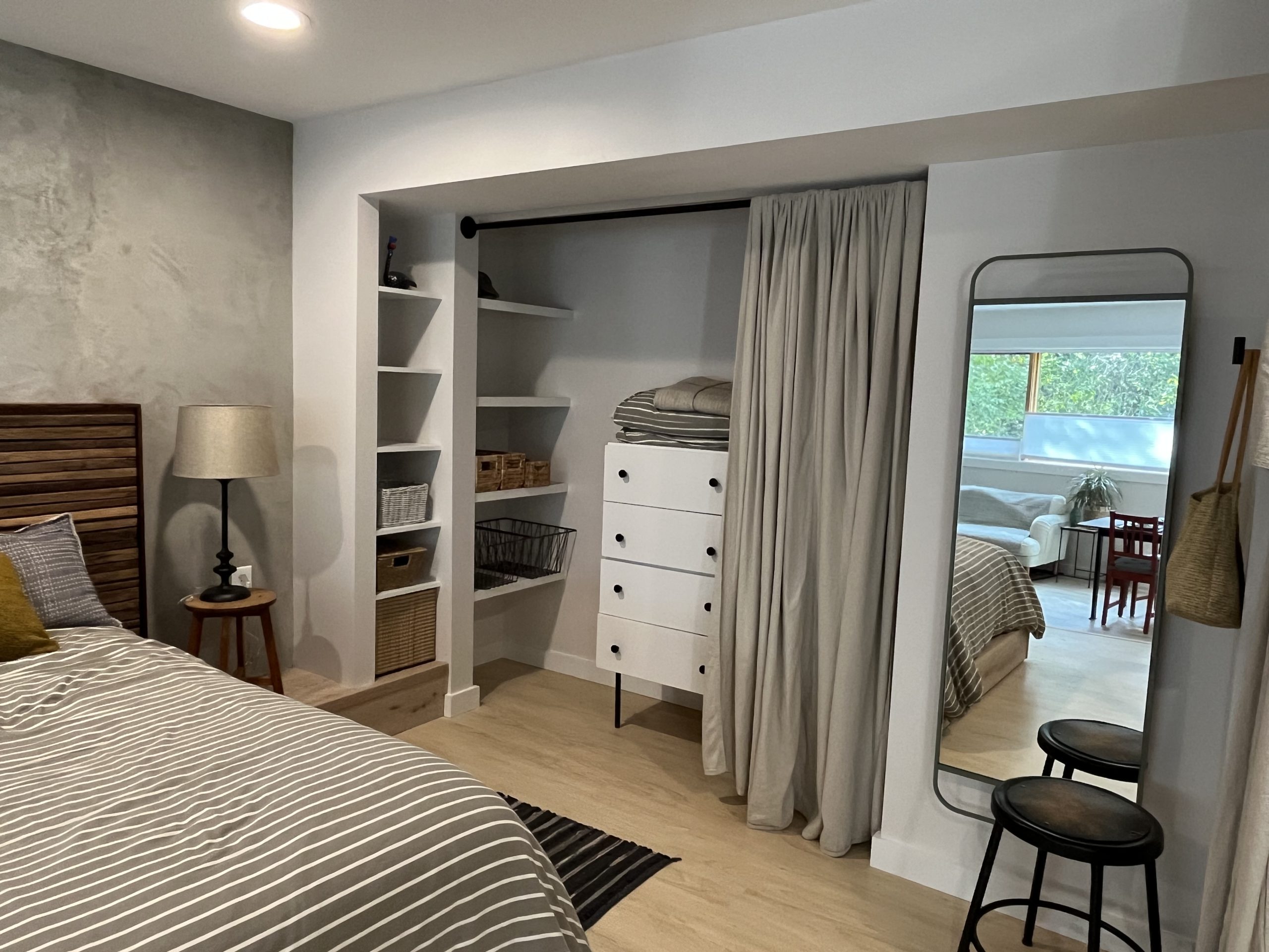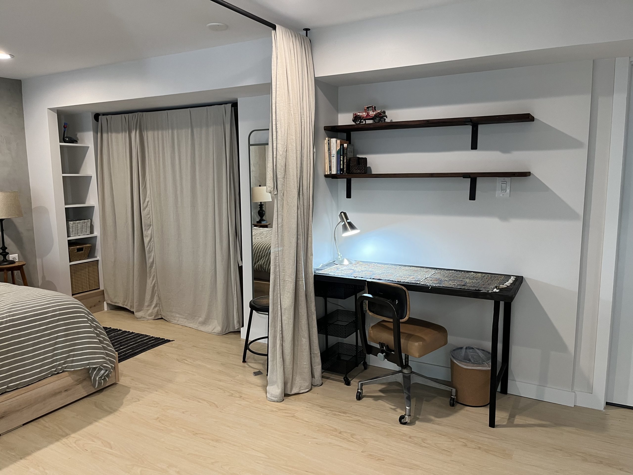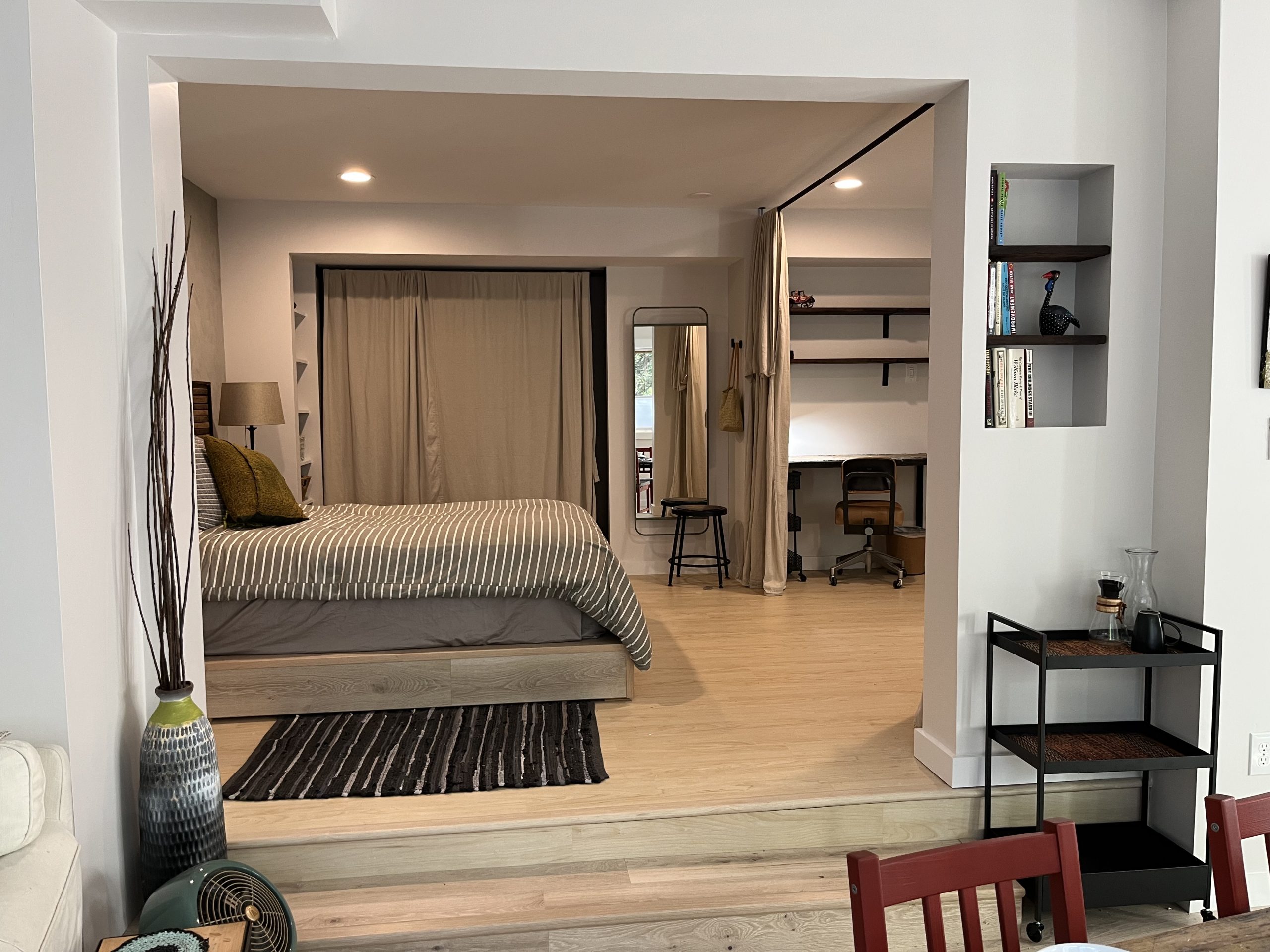 Tall curtains close off the sleeping area for a cozy and private rest. There is a generous closet area and a built study desk. Two ceiling heights (8ft and 9ft) allow for ample sunlight and tree filled garden views.