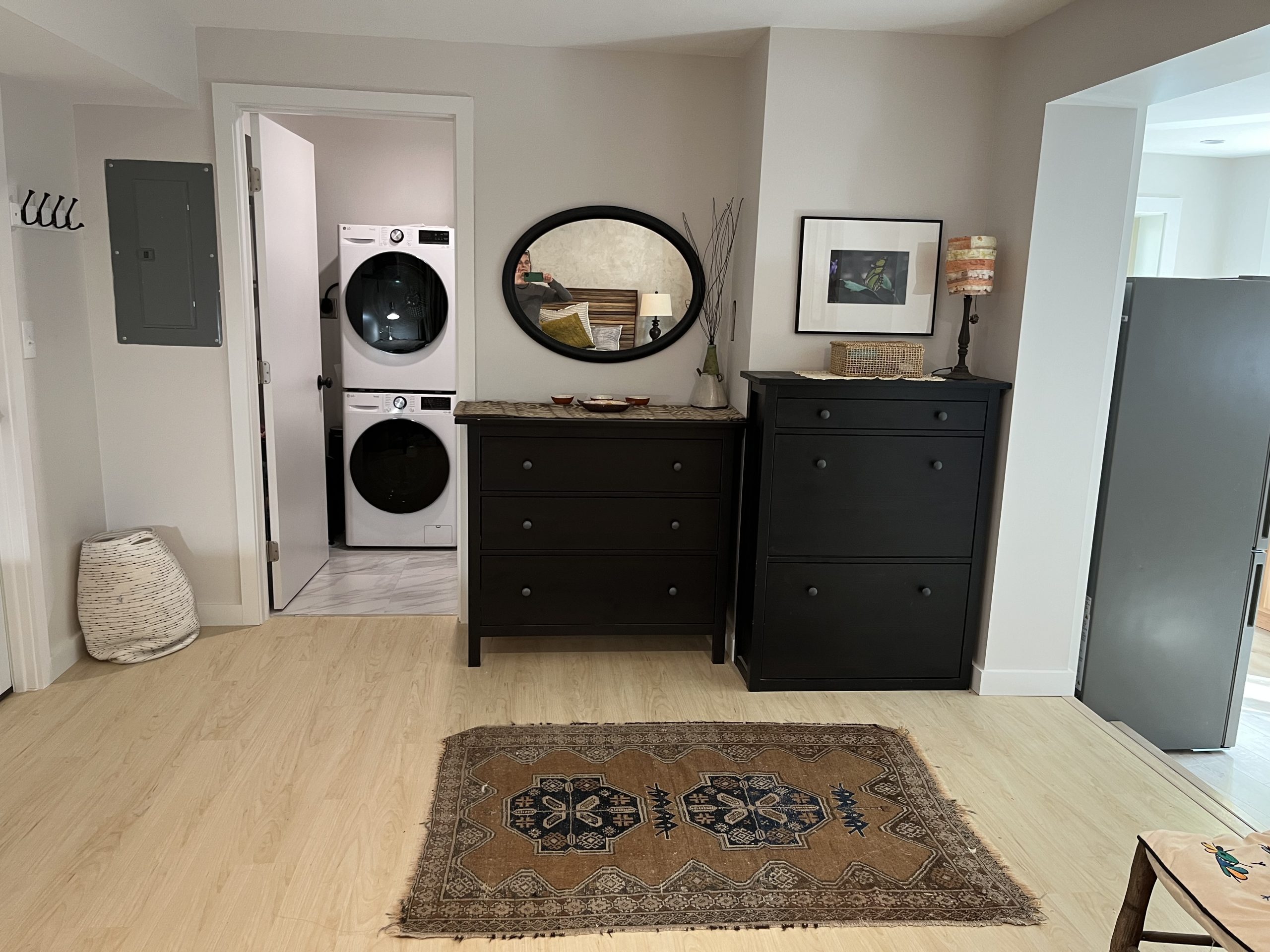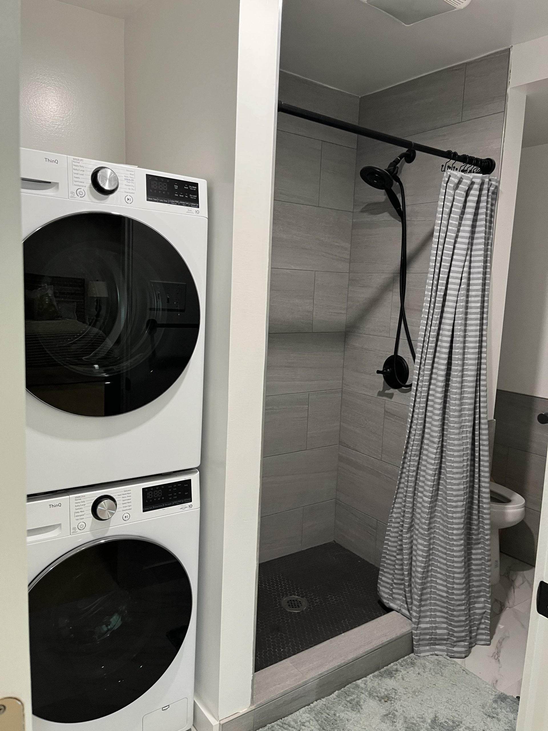 Extra storage is next to the washer and dryer in the bathroom. Towels and a set of linens are available.