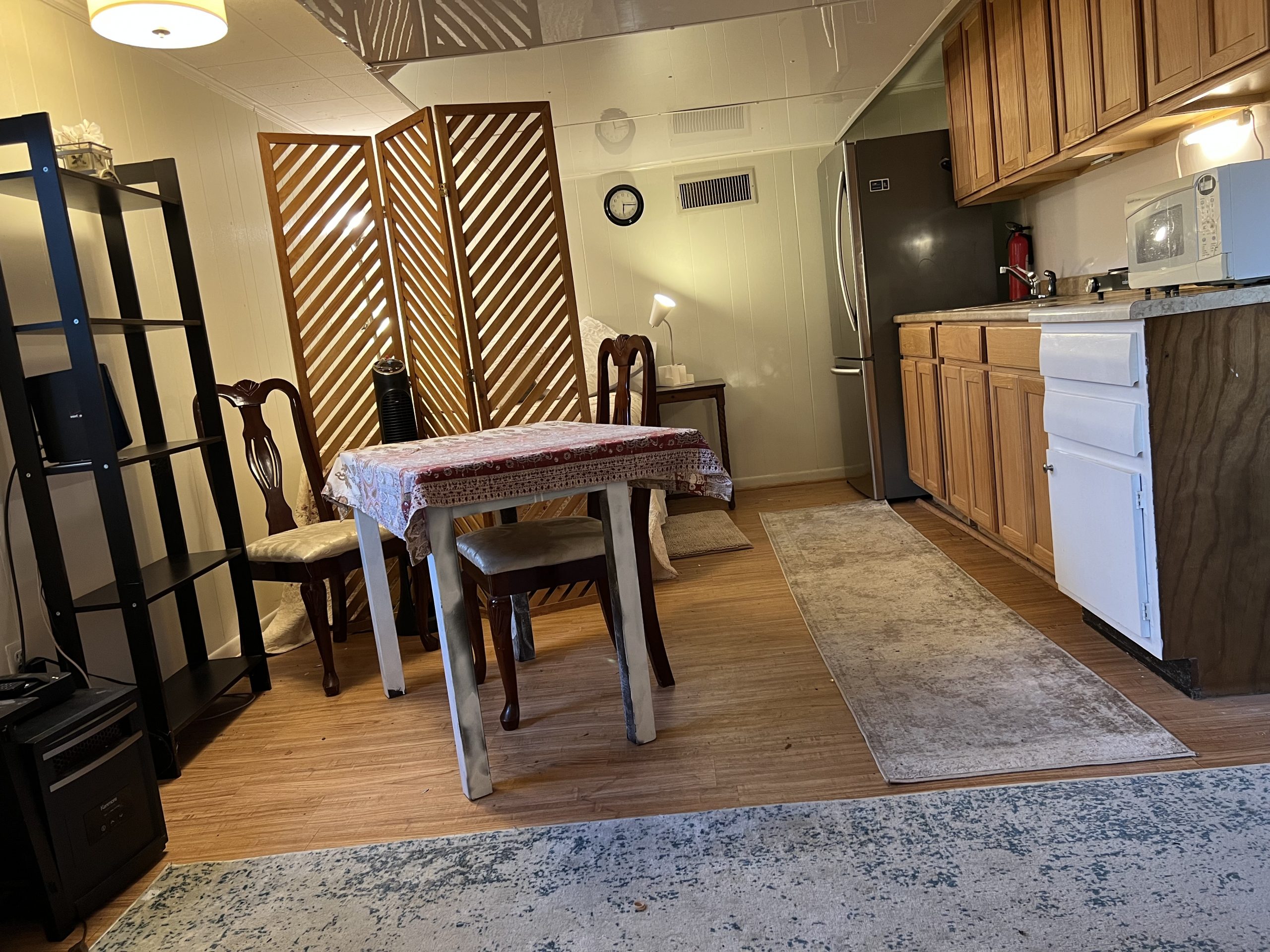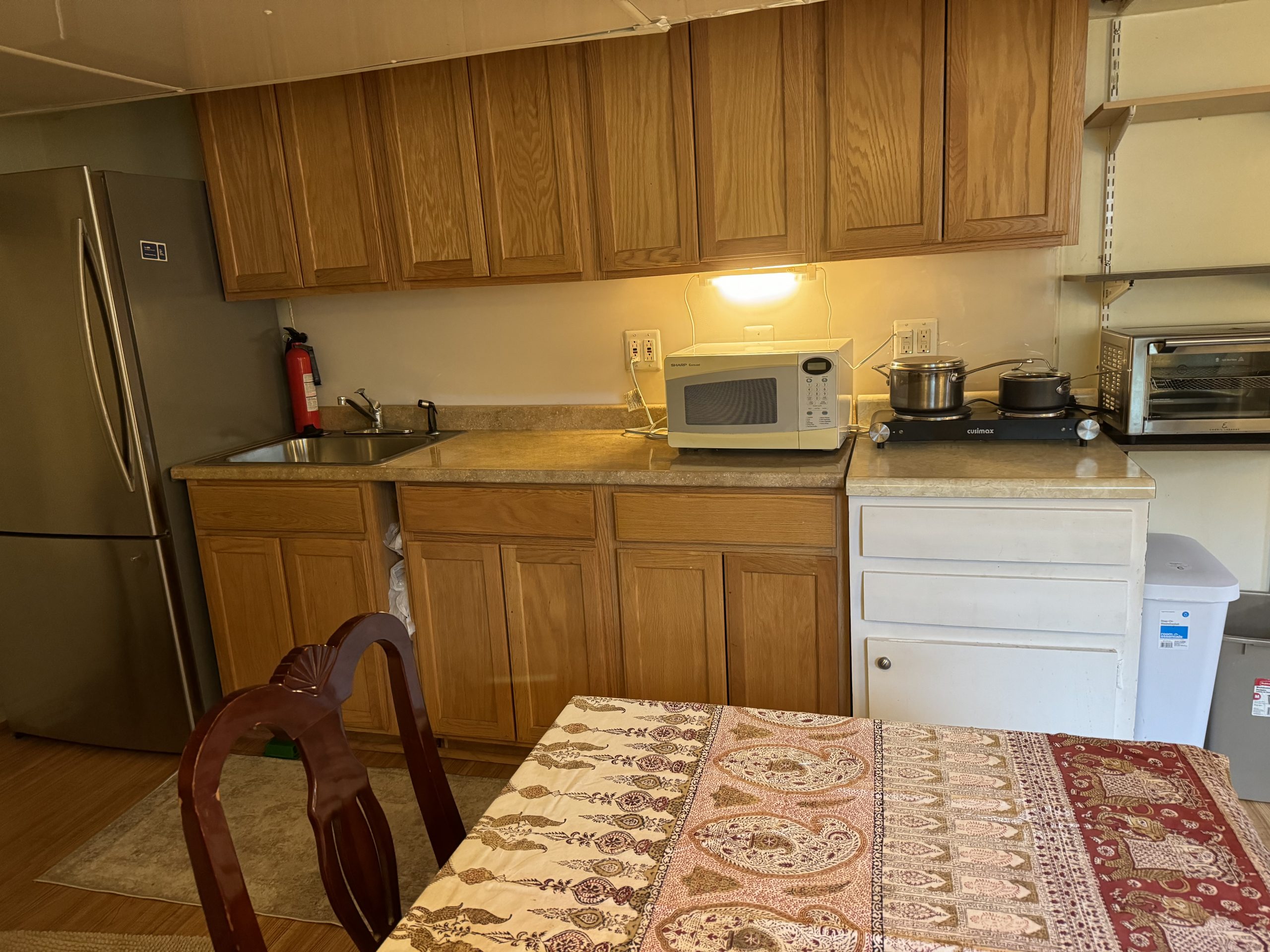 - Cooking prep area for simple meals has refrigerator, sink, garbage disposal
