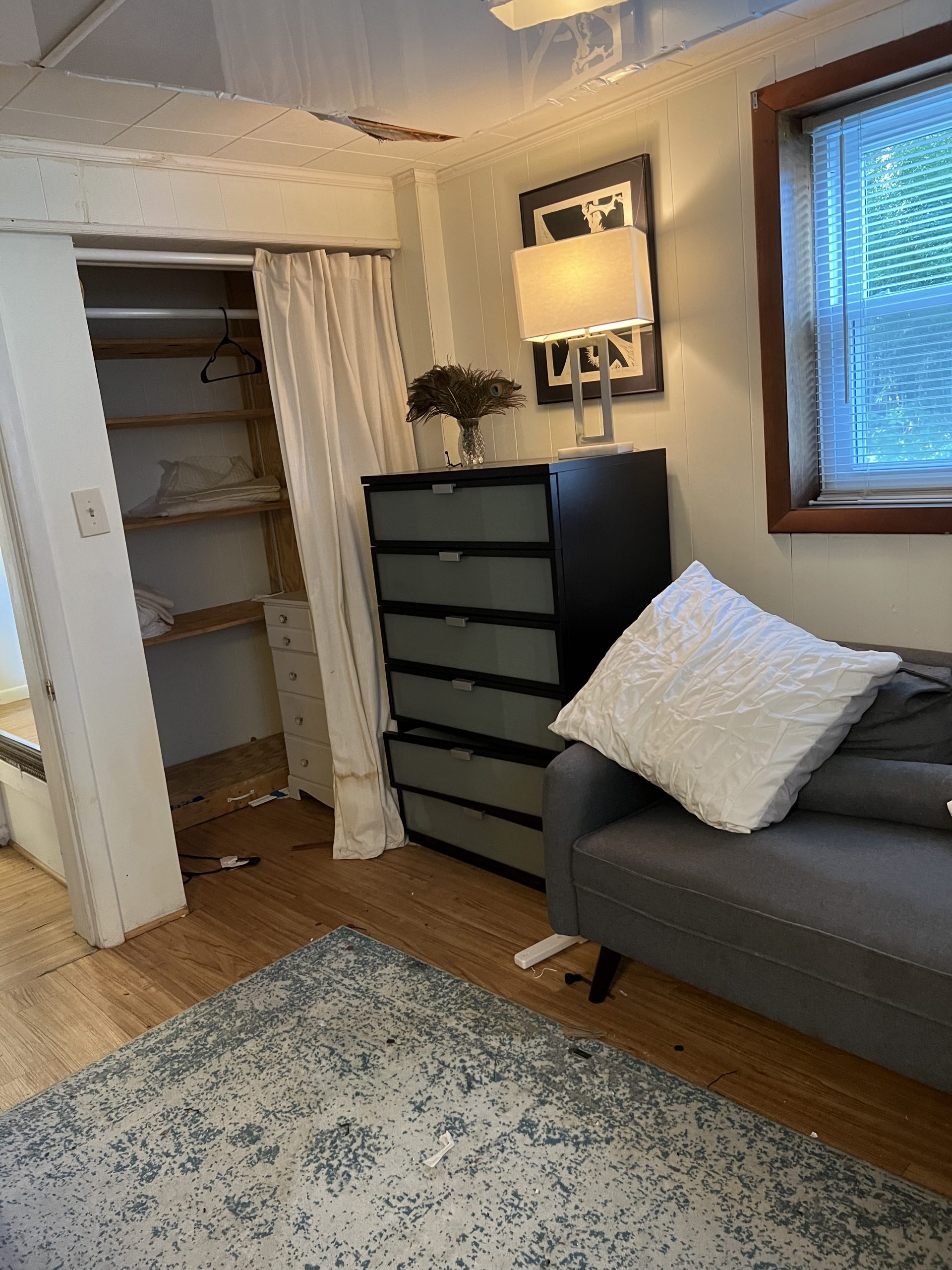 - Queen-sized bed with mattress topper, seven-drawer dresser, clothes rack; desk and chair. Linens provided.