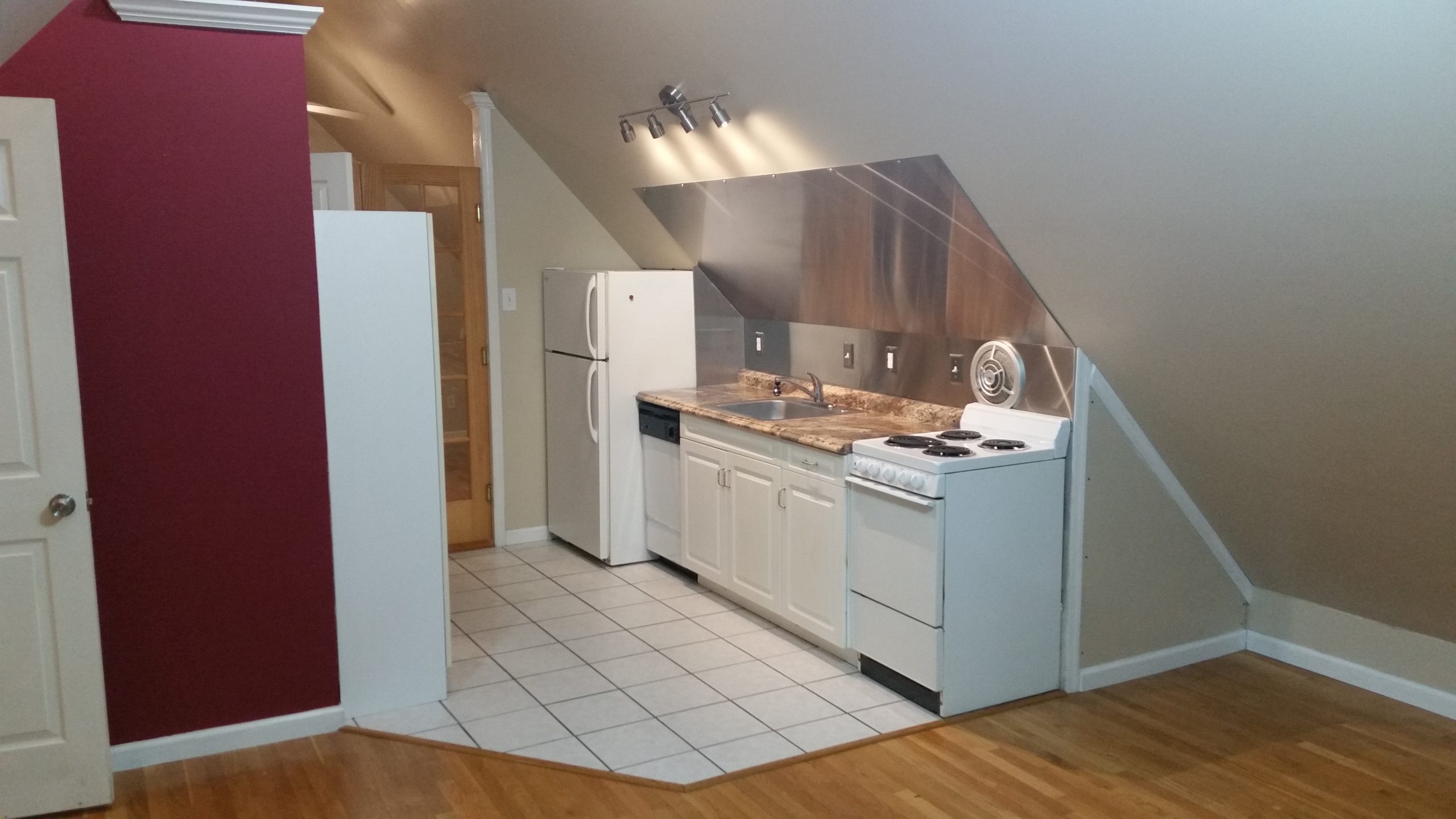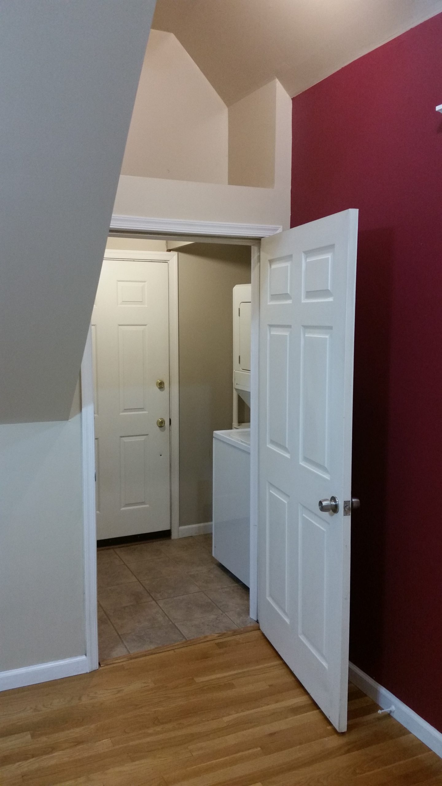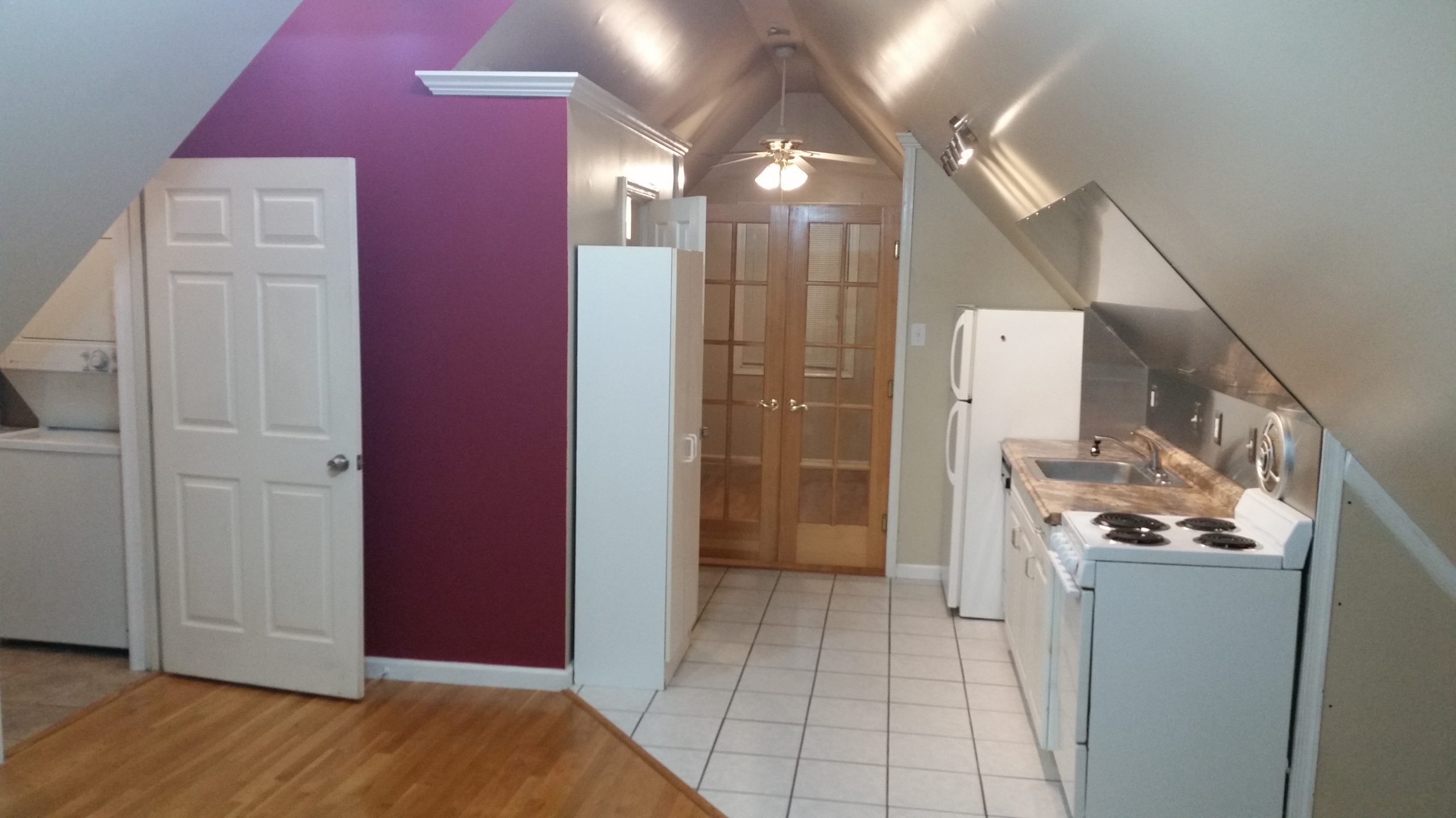 Apartment has 10 foot vaulted ceilings, hardwood floors, its own entrance and parking (2, plus, reserved off-street spaces), a full kitchen, washer and dryer, full tub/shower, storage area, and its own heating/air conditioning system controlled by the apartment occupant. It is its own apartment - i.e. completely separate living quarters from the main house, with its own entrance, its own parking area and no combined use space. There are 22 steps , under cover, up to the apartment.